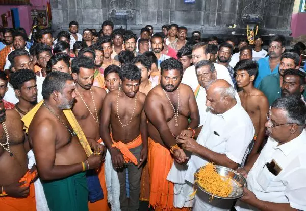 திருப்பூரில் உள்ள கோட்டை மாரியம்மன் கோவிலில், இந்து முன்னணியினர் விரதம் துவங்கினர்.