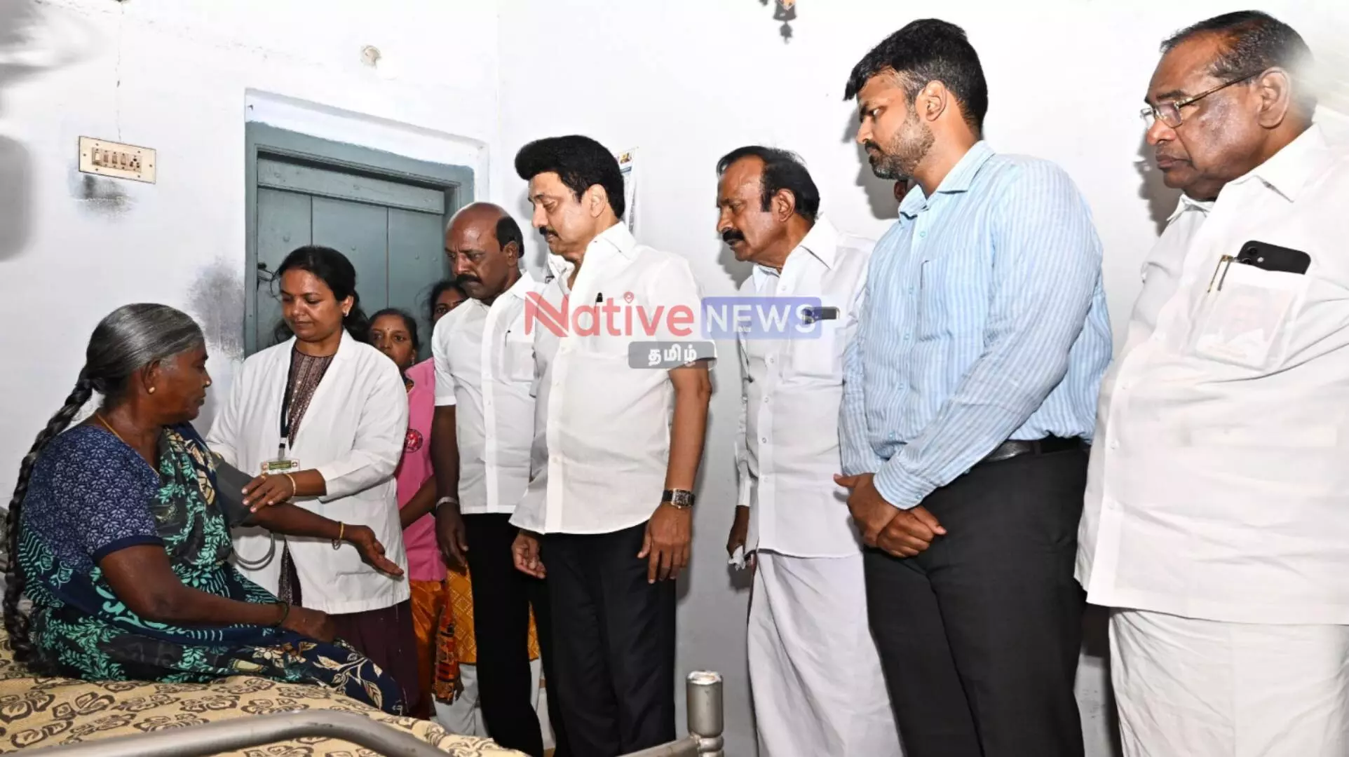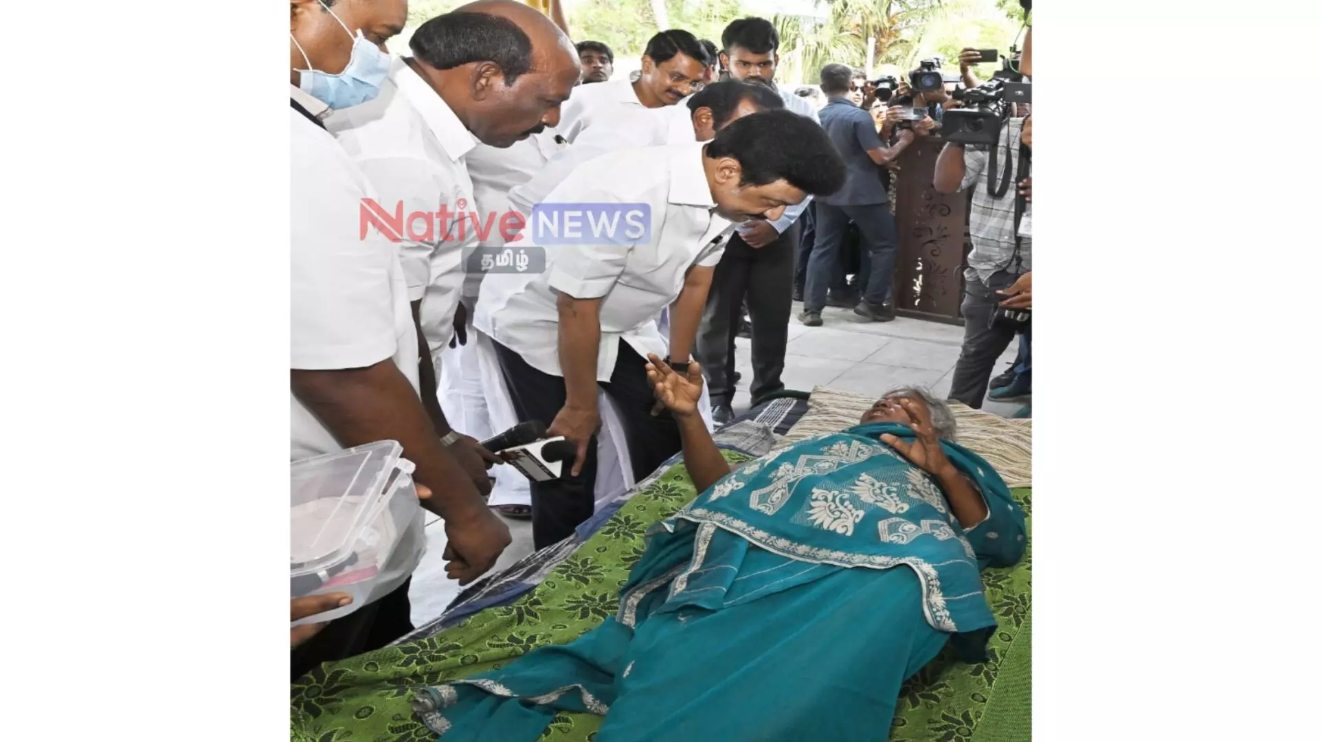 மக்களைத் தேடி மருத்துவம் திட்டத்தின் கீழ், இரண்டு கோடியாவது பயனாளியான ஈரோடு மாவட்டம் நஞ்சனாபுரத்தைச் சேர்ந்த சுந்தராம்பாள் வீட்டிற்கு நேரில் சென்று அவருக்கு மருத்துவப் பெட்டகத்தை வழங்கி, அவருக்கு வழங்கப்படும் சிகிச்சை முறைகளை பார்வையிட்டு, விவரங்கள் முதல்வர் ஸ்டாலின் கேட்டறிந்த போது எடுத்த படம். உடன், அமைச்சர்கள் சுப்பிரமணியன், முத்துசாமி, ஆட்சியர் ராஜ கோபால் சுன்கரா உள்ளிட்ட பலர் உள்ளனர்.