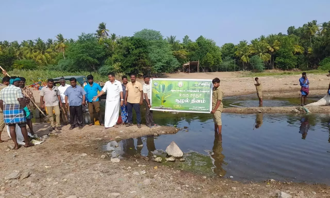 ஒவ்வொரு ஆண்டும் ஜூன் மாதம் ஐந்தாம் தேதி உலக சுற்றுச்சூழல் தினமாக கடைபிடிக்கப்பட்டு வருகிறது. இதனையொட்டி தமிழகத்தில் இன்று நீர் நிலைகள் மற்றும் ஆறு குளங்களை அந்தந்த பகுதியில் உள்ள உள்ளாட்சி நிர்வாகங்கள் தூர்வாருதல் தொடர்பான விழிப்புணர்வு நிகழ்ச்சிகளை நடத்தி வருகிறார்கள்.