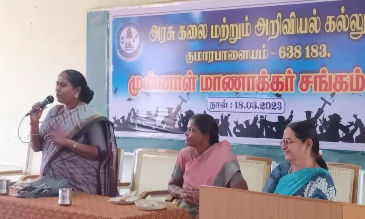 குமாரபாளையம் அரசு கலை அறிவியல் கல்லூரியில் முன்னாள் மாணாக்கர்கள் சந்திப்பு நிகழ்வில் கல்லூரி முதல்வர் ரேணுகா பேசினார்