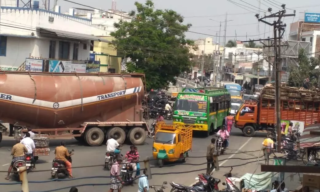 இதனால் குறுகிய சாலைகளில் வரும் பஸ், லாரிகள், கார்கள் உள்ளிட்ட இதர வாகனங்கள் செல்ல மிகவும் சிரமம் ஏற்படுகிறது. சரக்குகள் இறக்க குறிப்பிட்ட நேரம் ஒதுக்கி, போக்குவரத்திற்கு இடையூறு இல்லாமல் இருக்க நடவடிக்கை எடுக்க பொதுமக்கள், வாகன ஓட்டிகள் கேட்டுக்கொள்கின்றனர்.