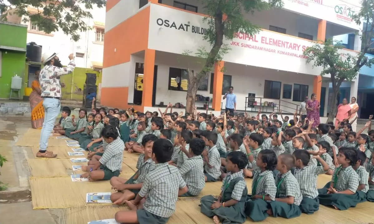 குமாரபாளையம் சுந்தரம் நகர் நகராட்சி பள்ளியில் சிரிப்பானந்தா பங்கேற்று, சிரிப்பு யோகா கலையை கற்பித்தார்.