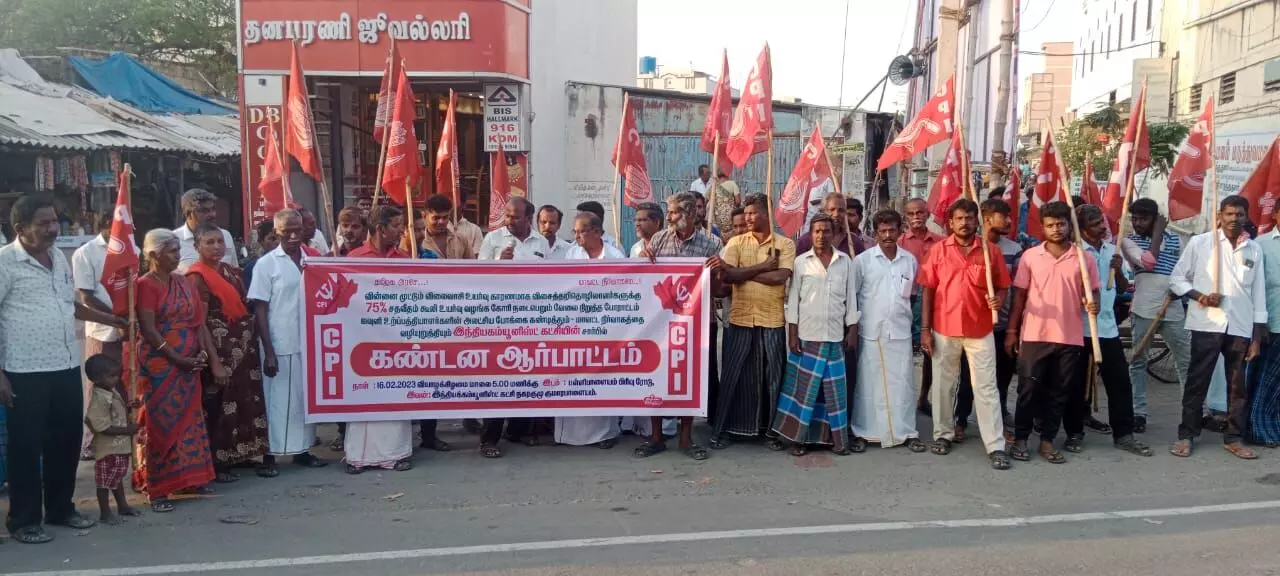 குமாரபாளையம் சுற்றுவட்டார பகுதியில் விசைத்தறி மற்றும் அதனை சார்ந்த தொழிலாளர்களுக்கு 75% சதவீத கூலி உயர்வு வழங்க கோரி தொழிற்சங்கங்கள் வேலை நிறுத்த போராட்டம் 15 நாட்களுக்கும் மேலாக நடைபெற்று வருகிறது. இது சம்பந்தமான பல கட்ட பேச்சுவார்த்தை இதுவரை தோல்வியில் தான் முடிந்துள்ளது. இதனால் தொழிலாளர்கள் வாழ்க்கை மிகவும் பாதிப்புக்கு ஆளாகியுள்ளது. மாநில அரசும், மாவட்ட நிர்வாகமும் 75% சதவீத கூலி உயர்வு பெற்றுத்தர வலியுறுத்தி இந்திய கம்யூனிஸ்ட் கட்சி சார்பில் நகர செயலர் கணேஷ்குமார் தலைமையில் கண்டன ஆர்ப்பாட்டம் நடைபெற்றது. நிர்வாகிகள் அசோகன், அர்த்தனாரி, அன்புமணி, மணிவேல் உள்பட பலர் பங்கேற்றனர்.
