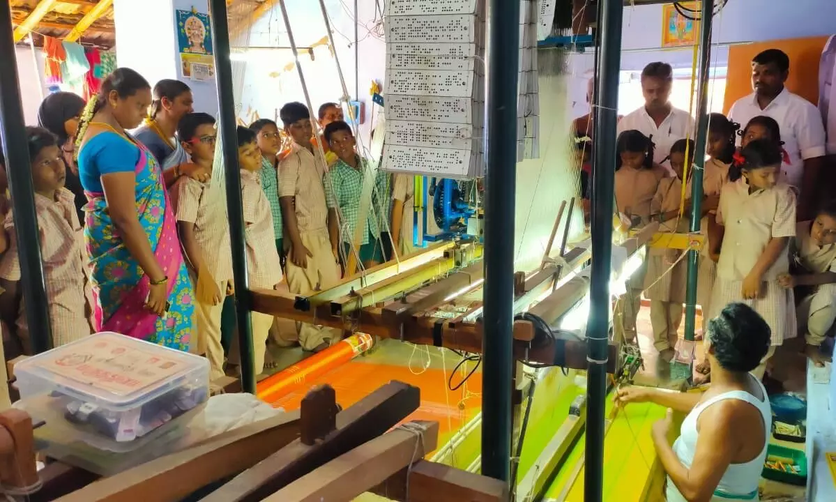 நெசவாளர்களுக்கு மாணவ மாணவிகள் நெசவு துண்டு அணிவித்து மகிழ்ந்தனர்.