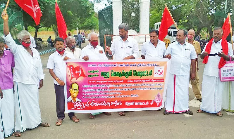 மேக்கேதாட்டுவில் அணைகட்ட முயற்சி: கர்நாடக அரசைக் கண்டித்து தேனியில் விவசாயிகள் ஆர்ப்பாட்டம்
