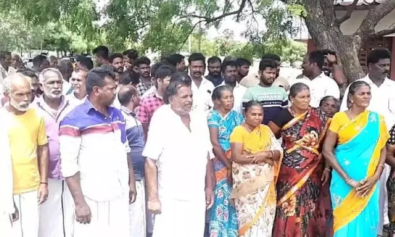 தூத்துக்குடி கலெக்டர் அலுவலகத்தில், போராட்டத்தில் ஈடுபட்ட பெரியதாழை மீனவ கிராம மக்கள்.